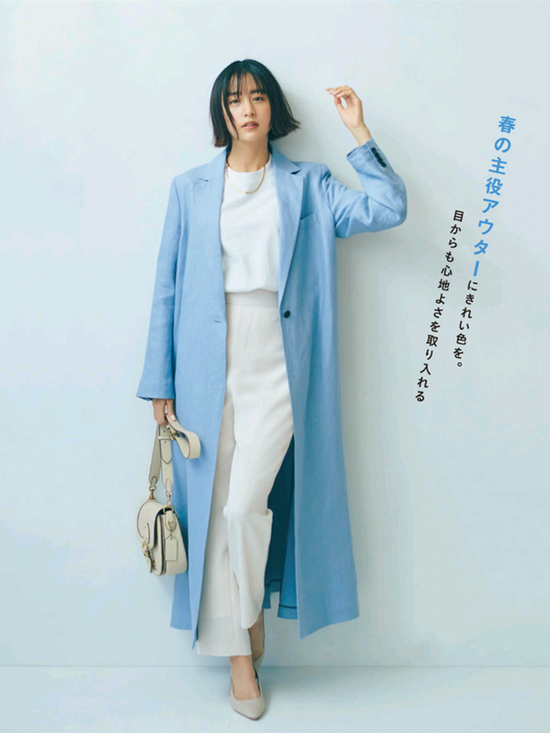 以白色T恤和白色直筒裤作为打底,叠穿一件蓝色廓形风衣,这一身LOOK清爽不失飒气。