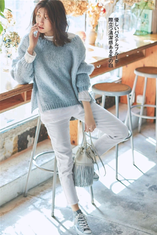 还可以把白T恤当做打底,叠穿蓝色廓形毛衣,下身搭配白色小脚裤和帆布鞋,这一身“同色搭配”满满都是时尚细节。