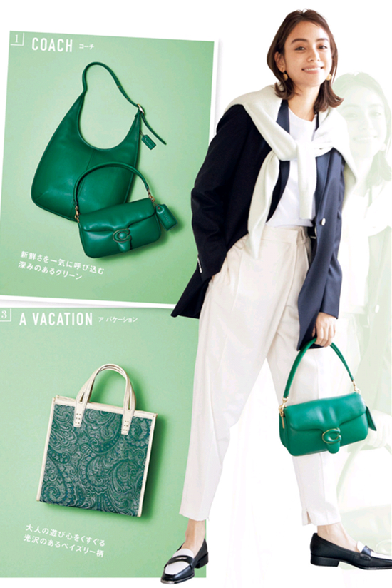 黑色西装与白色锥形裤组成“黑白配”LOOK简约分明,而脚下的一双绿色高跟鞋又格外醒目,带来了几分春日气息。