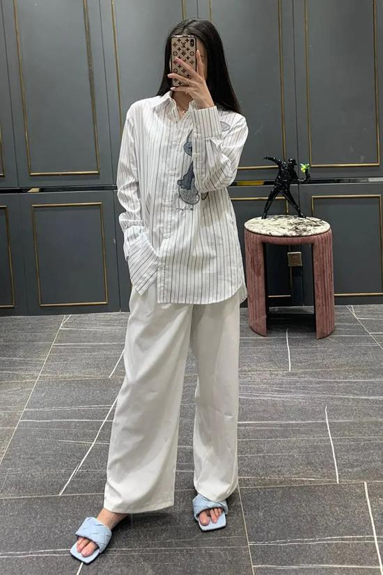 白色高腰阔腿裤显瘦又显高,但是搭配的时候一定要注意,如果上衣也是宽松oversize版型,不免会显得松垮,这样很容易压个子。