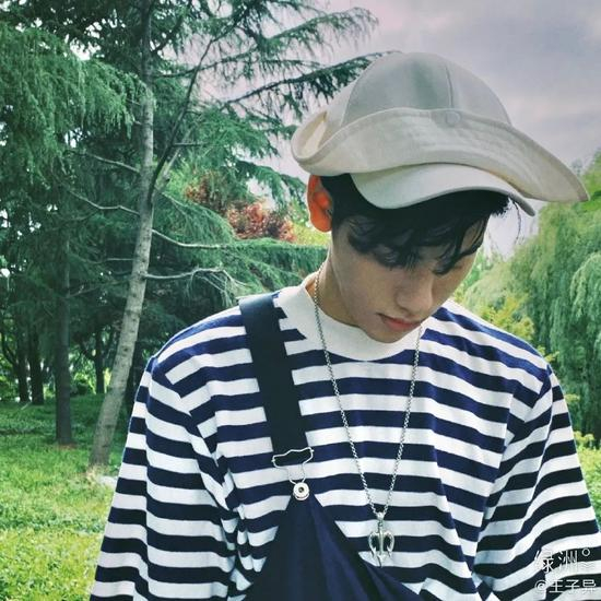 王子异的这身“森系”造型特别吸睛。蓝色条纹T恤充满怀旧气息,搭配同色系背带裤,最后用帽子做点缀。一瞬间,“萌感少年“近在眼前。