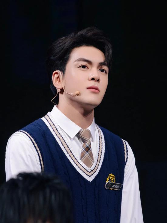 曾舜晞的这身造型十分舒适耐看,用挺括有型的白衬衫搭配蓝色提花毛线马甲,皇冠徽章和格纹领带做点缀,整个造型看起来低调有型,但又不失亮点。
