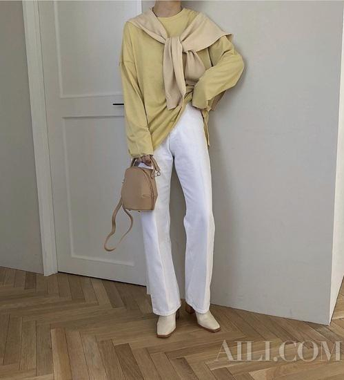 除了白色、裸色棕色外,Hara的穿搭也会尝试黄色、牛油果绿等更多色彩,但在色彩饱和度上很低,让整体搭配非常柔和。
