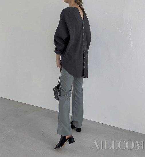 即使穿搭风格十分简约,也会在不经意间表达性感,解开扣子的V领针织和锁骨的组合修饰肩部线条,还有减重的视觉效果。