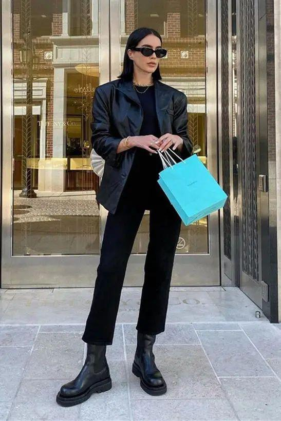 内搭一件黑色T恤,再穿一双黑色短靴,全黑LOOK超级帅气!