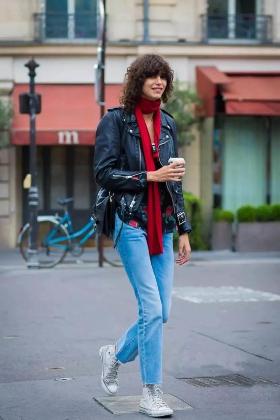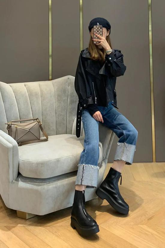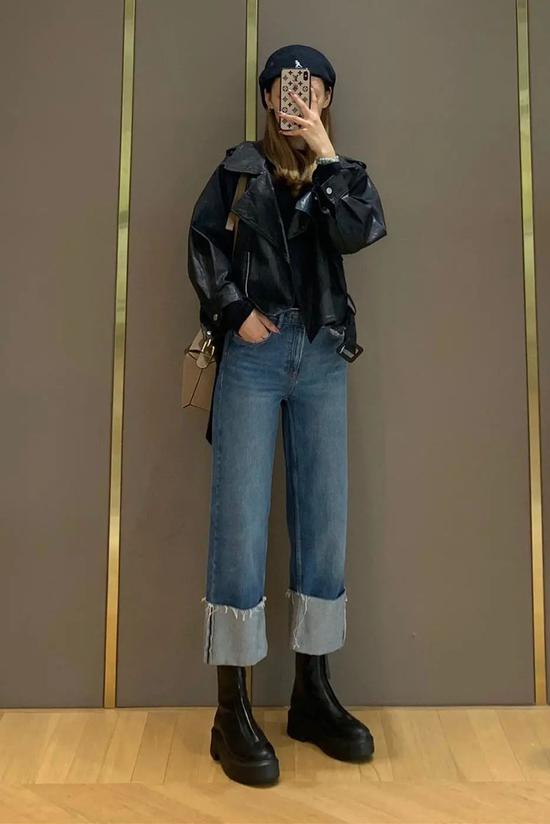 比如换一条拼色款牛仔裤,两色拼接更有设计感,与黑皮衣搭配更加时髦!