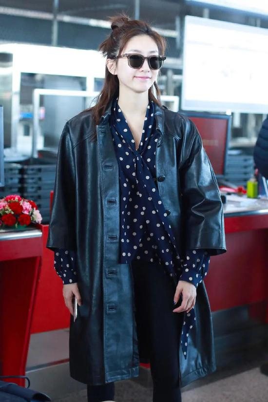 而像江疏影穿的这种飘带衬衫更方便,飘带完全充当了丝巾的作用,外穿一件皮衣,时髦又兼具女人味。