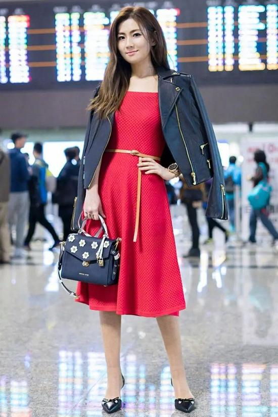 Selina任家萱穿上红色一字领连衣裙,搭配黑色皮衣,甜美中见型格,有效提亮了整体着装造型。