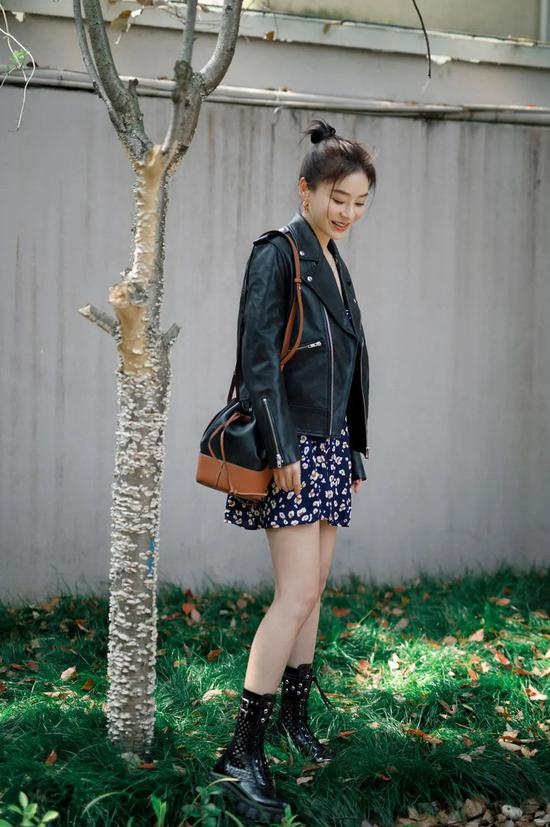 最佳搭配就是印花连衣裙,就像杨采钰,一件蓝色碎花裙作为打底,纵然外穿黑皮衣也照样挡不住小清新气息~
