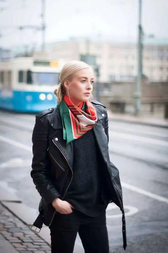 除了纯色丝巾还可以系条彩色丝巾,为整体造型添加时髦感。