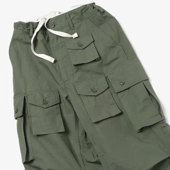 但是也不能说铃木大器对军工装风格单品的认知是完全来自于美国的,就比如这次被我们一眼相中的这条 Engineered Garments FA Pant,实际上设计灵感是来自于上世纪 40 年代法国伞兵的裤装,这一点从具体的设计就能看出端倪——按照容纳物品的大小进行细致划分的翻盖式口袋,是法国伞兵裤的典型特征之一。把这样的特点带入到现在的工装裤市场来看,我们会更看重它的实用性,像钥匙、钱包、手机、香烟、耳机盒这种随身携带的东西都能‘各得其所’,再搭配上方格纹路的 Ripstop 防撕面料,就能将它的耐用、实用特征更进一步地表现出来了。