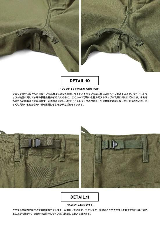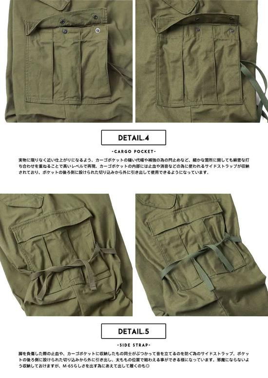 在设计方面,WAIPER M-65 Field Cargo Pants 对 R.L.DAVIS MFG。 CO,INC (以前的一家军服生产商) 生产的 M-65 军裤做出了最大程度的还原。WAIPER 列出了这款单品与 1968 年推出的 M-65 对比的多处细节,从容易被注意到的口袋、绑带这些部分,到拉链、纽扣、腰带、裤裆等各处细节,都能觅得 WAIPER 在打造军工裤时追求‘忠于原味’的玩法。