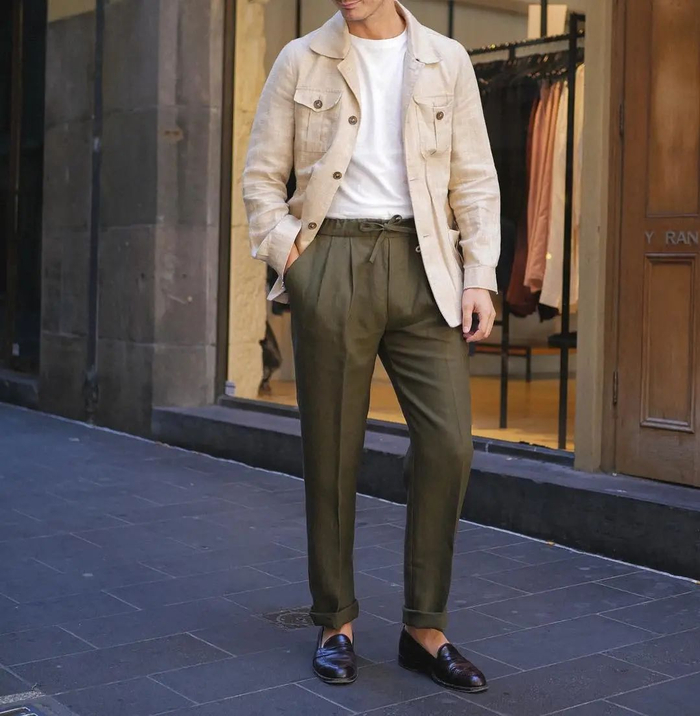还好实际能选择的棉面料有很多,既能诠释朴实自然的绿(如CHINO),也能编织出精致得体的绿(如华达呢);而在亚麻这一画板上,再沉稳的绿色调都依然能在近看时保有别具风味的一面。
