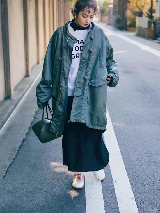 短款风衣外套做叠穿,oversize版型有极好的包容性,叠搭几层都不会显臃肿。