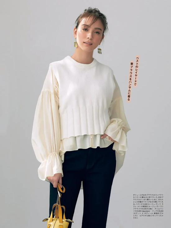 在“叠穿”造型里,往往中间的部分会比较受重视,因为它能看到的面积较大,作为过渡单品一定要好好挑选。