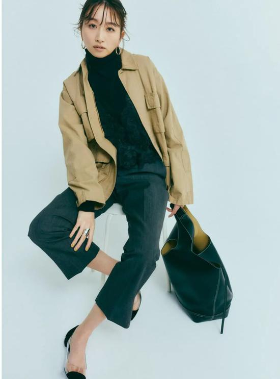 黑色高领打底衫则更倾向于展现酷帅一面,与经典卡其色外衣结合,整套look看起来复古且质感。