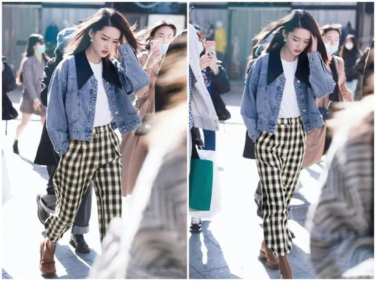 就连向来温润如水的李沁也爱上了烟筒靴的酷帅干练,她身着撞色尖领牛仔短上衣,下搭黑白格纹拖地裤搭配棕色烟筒靴,走路带风超酷超飒!