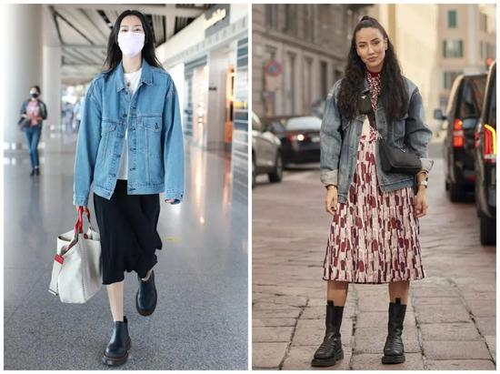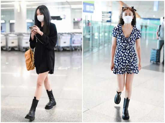 走机场的程潇、刘芸都是以连衣短裙搭配烟筒靴,甜美与酷帅结合,两种风格并存。