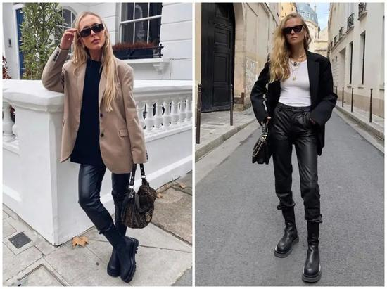 当皮裤遇上皮质烟筒靴,整体look质感升级更有高级的味道。
