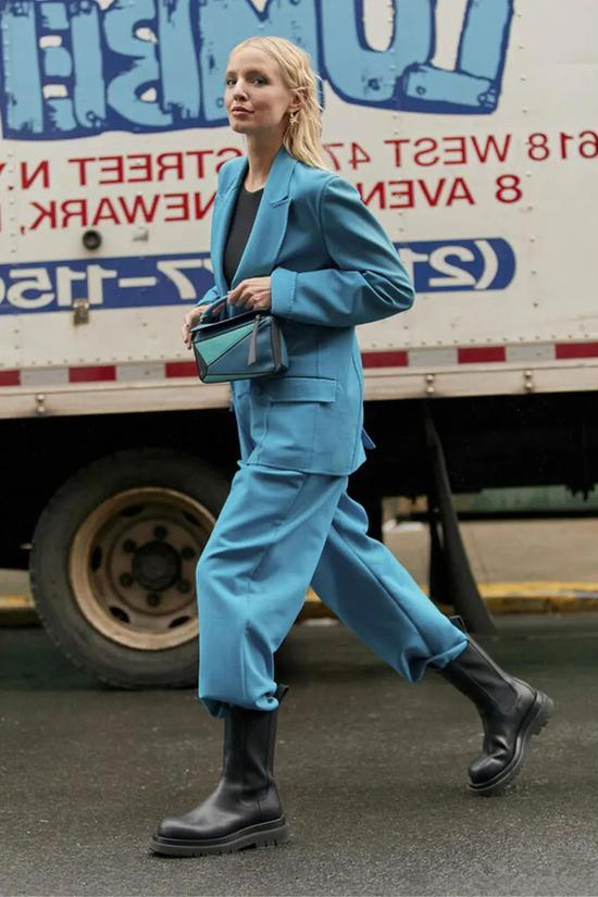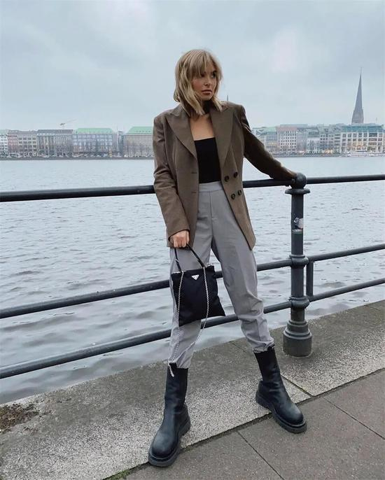 想不到西装裤跟烟筒靴也能进行混搭,明明是两种风格属性单品,但结合起来意外协调和高级!