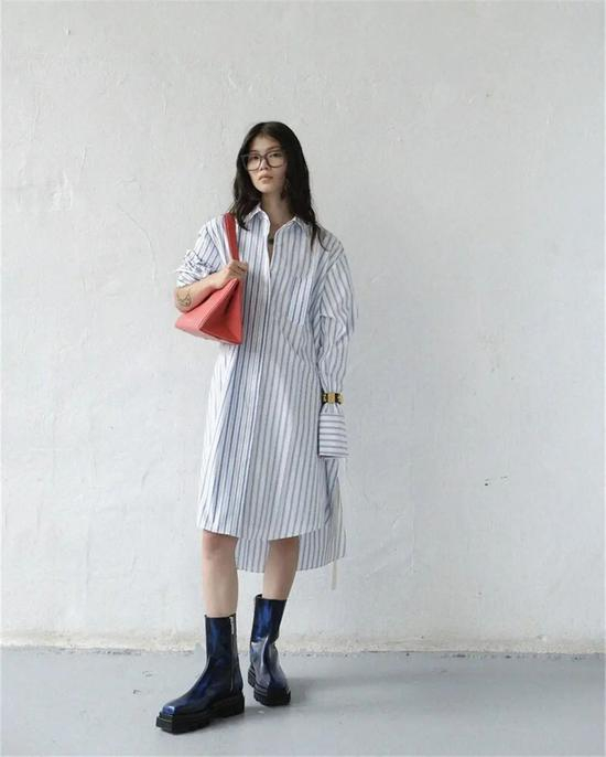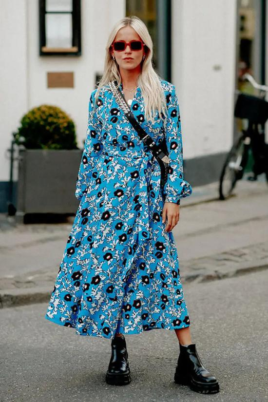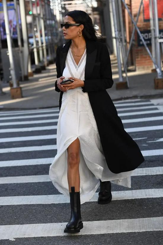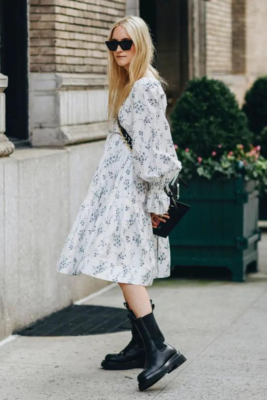 温柔雅致的连衣裙与酷帅霸气的烟筒靴搭配,虽然是混搭但高级感十足!