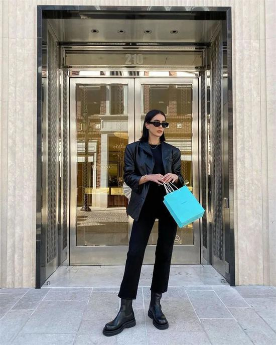 而且皮裤本身就有一定的约束腿型的作用,把裤脚塞进烟筒靴里,看着更显分明利落,飒气的很呢!