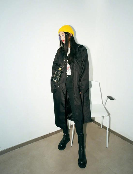 00后小娜比欧阳娜娜也紧跟流行趋势,用一条卷边牛仔裤配黑色烟筒靴,看起来成熟又帅气。