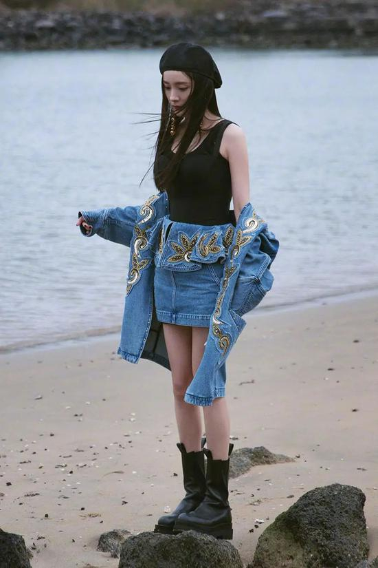 就短裙来讲,它是最容易跟烟筒靴搭配的。大幂幂杨幂就以一身牛仔短裙装搭配烟筒靴,秀出美腿清凉又惹眼。