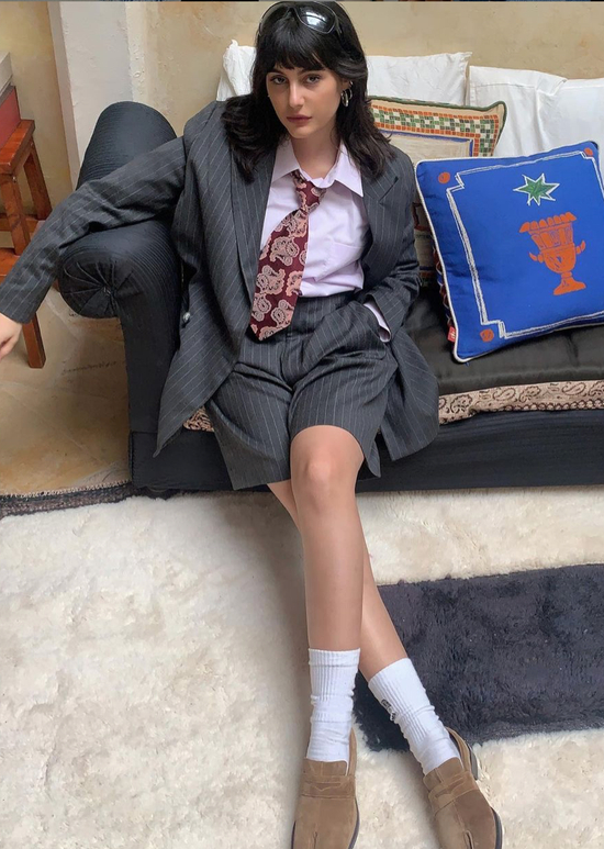 Maria选择回归学院风:她用灰色条纹西装外套+成套的短裤,营造中性少年气的氛围。脚上浅棕色的分趾乐福鞋呼应了同是暖色系的酒红色印花领带。右边这张图她是用红棕色系针织裤去呼应这对乐福鞋,暖色相搭很顺眼~