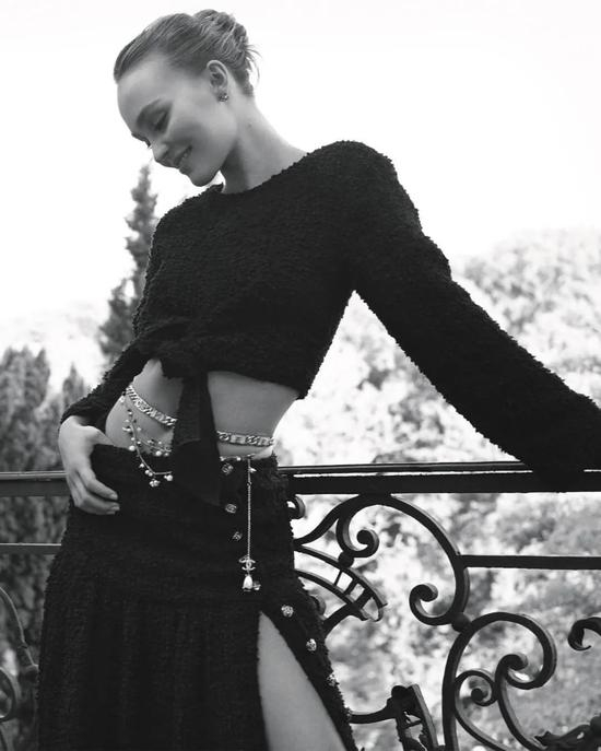Lily Rose 也多次示范腰链穿搭,不管是搭配高腰牛仔裤还是黑丝露腰套装裙,都完美地展现出了一种女人独有的复古风情。