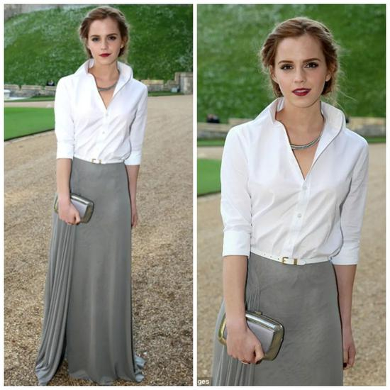 再来看看长裙,这一件则是巧妙地加了一根白色腰带,下身搭配的不规则设计长裙也是很好看,优雅有味道。