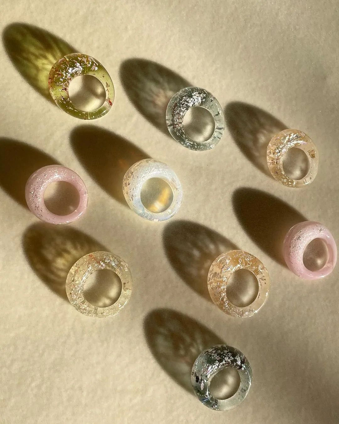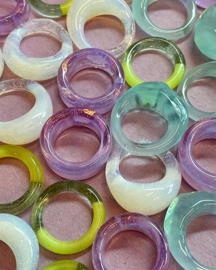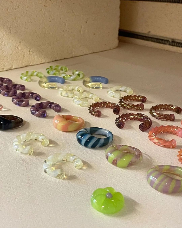 纽约来的KEANE在彩色戒指里杀出重围是靠玻璃材质,产品采用手吹玻璃的方式塑形、上色、创造波纹,让每一次空气的吹入形成的纹理都是独一无二的,辨识度超高。