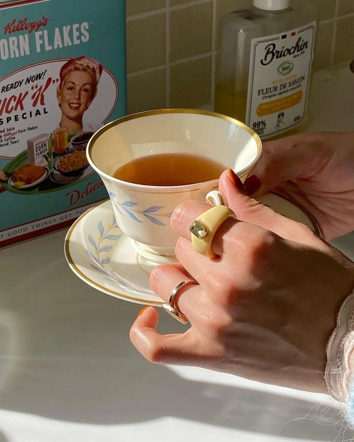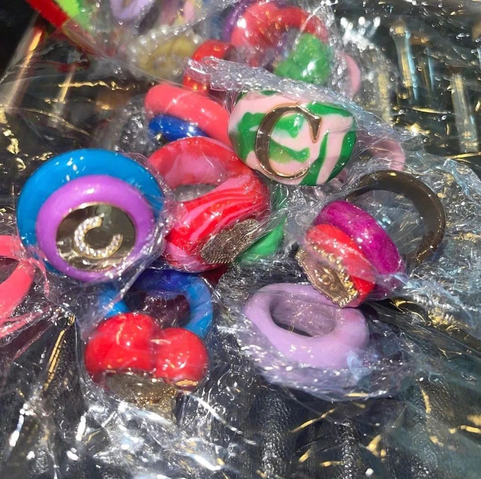 品牌的当家头牌是彩色树脂戒托+大颗金属点缀,戒指呈圆形或方形,上面镶嵌金属,鲜艳复古的糖果色加上金属材质,刚好有点Y2K那味儿,难怪千禧辣妹会爱。