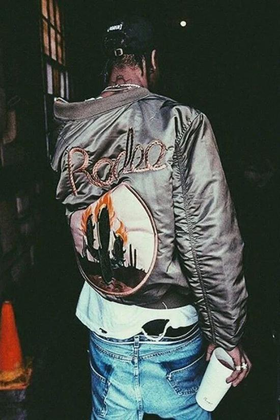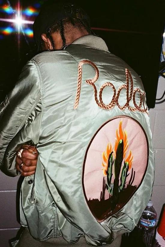 Travis Scott 与美国军事品牌 Alpha Industries 推出的《Rodeo》周边 Boomber,共有黑、绿两个配色,背面带醒目的 Rodeo 刺绣和火焰仙人掌拼布,当时一度炒到 2000 美元以上。
