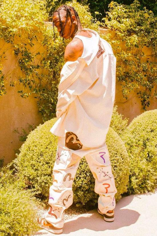 Travis Scott 对牛仔单品的痴迷众所周知,平时除了 Saint Laurent、KAPITAL,日本牛仔老牌 Evisu 也在他的日用清单之中,2020 年 Travis Scott 在 Instagram 官宣与 Evisu 的合作,完全没有让人感到意外。