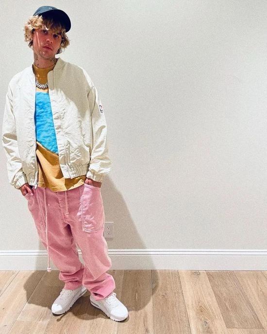比伯用白色 T 恤搭配浅粉色的裤子,帽子、衣服和裤子上都带有可爱的卡通印花图案,加上鲜嫩可口的颜色就像一份精致的法式甜点。