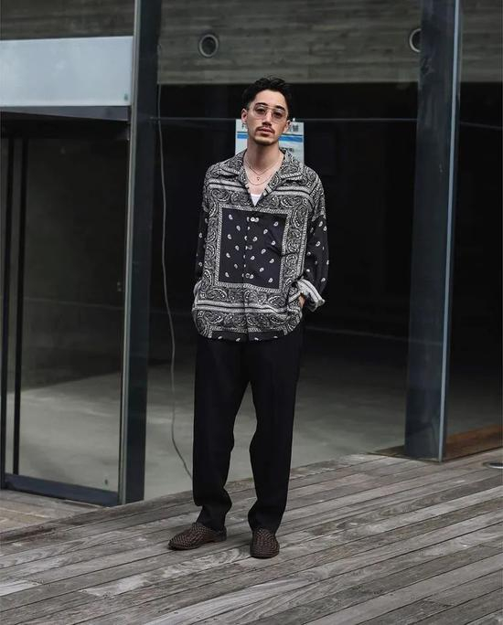 而想尝试像以 Wacko Maria 为代表的武骨风“坏男孩”们,大可选择饰有如腰果花、骷髅头等印花元素的古巴领衬衫款式,与形成反差的体面西裤构成 Rude Boy 造型,雅痞气质瞬间拉满。