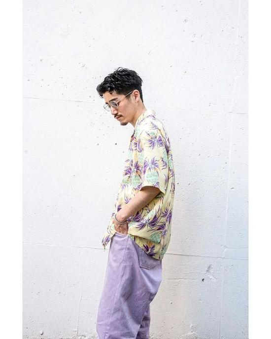 所以可以看到很多如玫红、姜黄、粉紫等明亮色彩,或带有热带绿植图案以及油画的古巴领衬衫常常出现在 Haruki 的造型中, 并不会拘泥于黑白灰蓝。