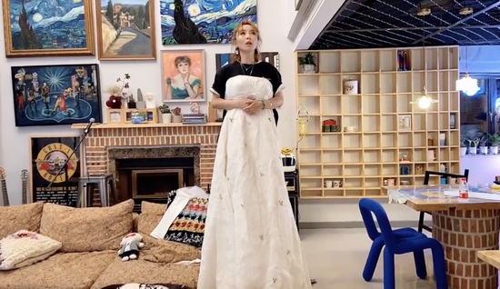 朋友借给她自己结婚时候的婚纱,让她用来当演出服。