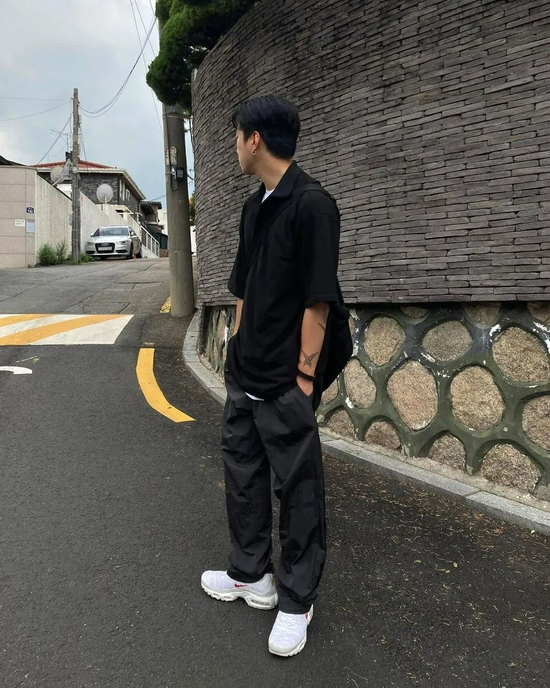 Mino 宋旻浩的 Polo 衫穿搭真是绝绝子,白色Polo 衫加上宽松休闲裤确实有点老爸的味道。却搭配了一双黑色的凉鞋和托特包,将年龄往下拉,独特的搭配斯文又不会太老气。