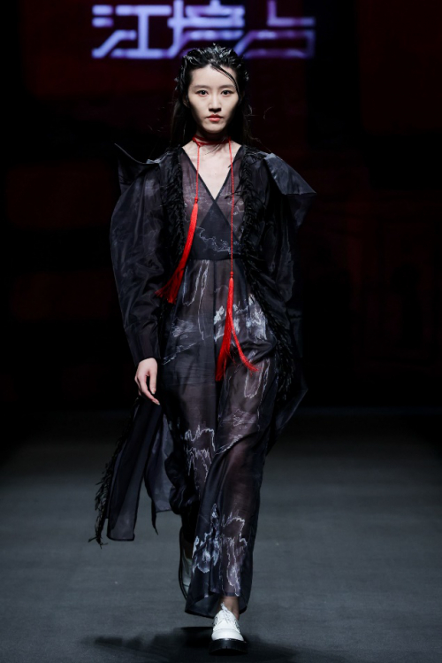 易经系辞:“是故易有太极,是生两仪”。对宇宙万物加以东方哲学解释的太极文化,一直是国人看待宇宙、自然、社会、群体、自己和他人的独特思维方式与特殊密码。此次发布会,宋培占在其作品中以材质挺阔硬朗为阳,柔顺悬垂为阴;以面料平纹表阳,肌理褶皱表阴;以局部解构夸张为阳,简约顺畅廓形为阴;二次再造肌理丰富的棉质面料、阴阳动感的压褶醋酸面料、黑白可变的双面鳞片等材料,加之太极图黑白色组合为主色调,并借中国红配伍、自然色点缀,彰显“道始于一,一而不生,故分而为阴阳,阴阳合和而万物生”的理念。