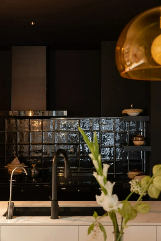 厨房橱柜做成了I+L型,I型橱柜靠墙做烹饪功能,台板、燃具和油烟机都选用了黑色。墙面只有下半用了手工砖,两种材质拼在一起让墙面的黑更加丰富。