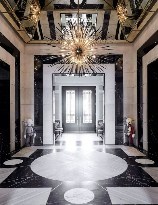 走进Drake的4645㎡的豪宅,映入眼帘的就是玄关的两尊Kaws人偶,抬头看房顶,是由Rafauli所设计水晶吊灯,走廊的尽头摆着Bösendorfer与村上隆的联名钢琴,在世界上仅有三座。