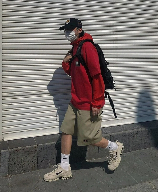 下面这一套也是用了今天介绍的两种穿法,没想到吧~先是长袖上衣搭配短裤,其实上衣又是由 T 恤和同色帽衫组成,细节满满。