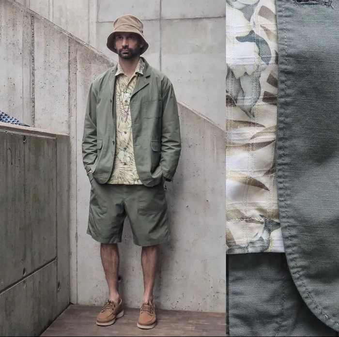 这一套便是一个非常经典的示范,上身和下身都选择了一件 Engineered Garments 经典的夹克与短裤,单看起来是会有点斋,但内衬选择了一件花哨张扬的夏威夷衬衫,中和了工装单品带来的粗犷感。