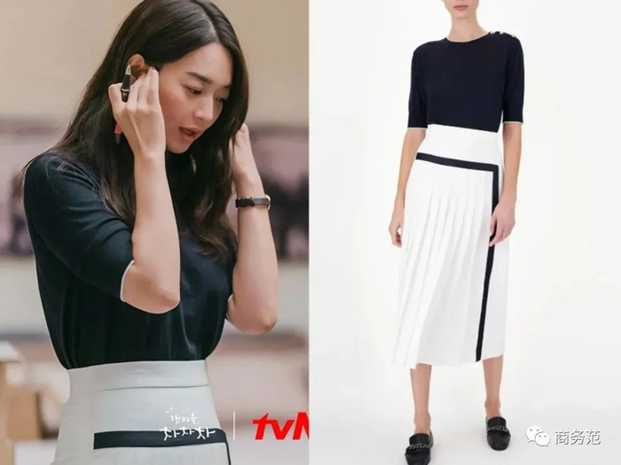 这种短袖针织衫她经常穿,像是这件黑色的就来自Max Mara,袖口有白色镶边,和同品牌半裙相呼应,是优雅的职场lady。
