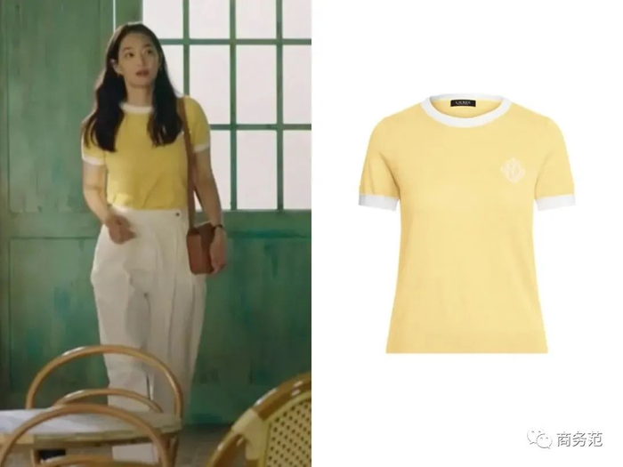 黄色针织短袖来自RalphLauren,领口袖口都有撞色小心机,比较有活力。