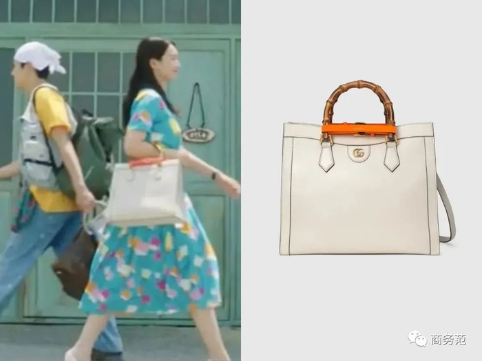 这只Diana是Gucci新出的it bag,竹节手柄加上亮色绑带,很有视觉冲击力,配的印花裙也是Gucci。