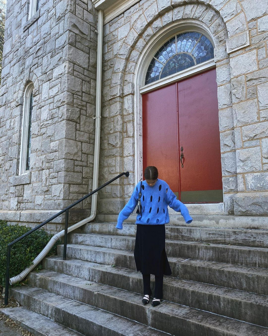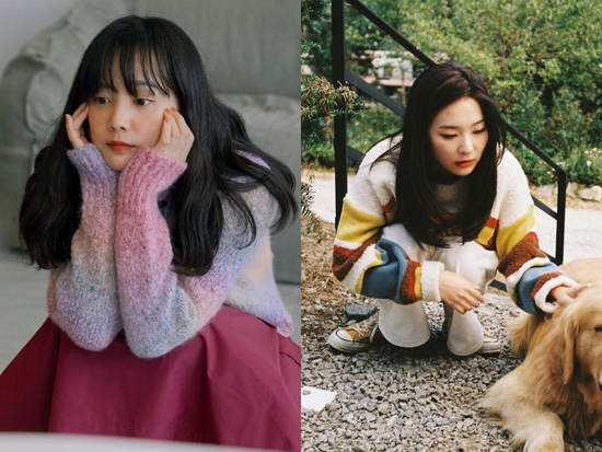 时尚博主Irene Kimy演绎的是亮色版本,梦幻的蓝紫色毛衣搭配一条同色系灯芯绒长裤,太适合笑起来甜甜又可爱的女孩子惹!