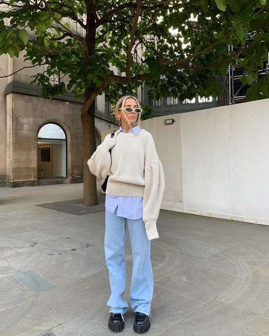 毛衣里套上一件衬衫,搭配今年秋冬流行的Baggy牛仔裤也是绝绝子~